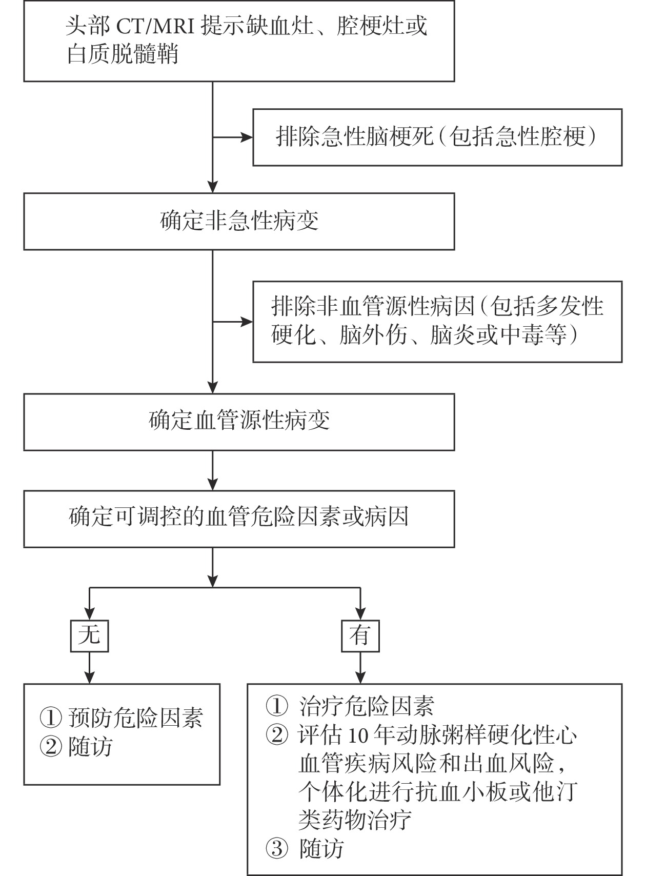 診斷流程(圖1)包括:① 應區別是急性還是非急性病變:排除急性腦梗死(包括急性腔梗),MRI 的彌散加權成像對鑒別急性病變有幫助;② 確定是否為血管源性病變:排除多發性硬化、腦外傷、腦炎或中毒等病史;③ 確定可調控的血管危險因素或病因。